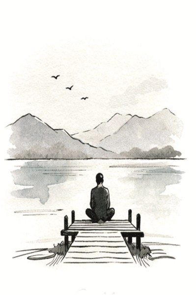 Der Schüler legte langsam die Flöte beiseite und setzte sich. Das Wasser fiel weiter – Tropfen um Tropfen. Er lauschte. Der Klang wurde weiter, tiefer, lebendig. Nicht mehr Lärm, sondern Herzschlag. Nicht mehr Störung, sondern Wahrnehmung. Er spürte, wie sich etwas in ihm öffnete – dort, wo er zuvor weggesehen hatte. Und inmitten des Tropfens fand er, was er gesucht hatte: Seine unerschütterliche Mitte, die kein Lärm von außen zu übertönen vermag.